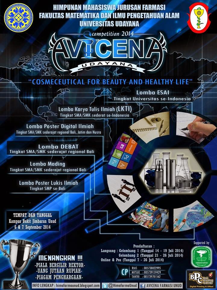 Tema Avicena Competition 2014 : “ Cosmeceutical For Beauty and Healthy Life ” Sub Tema masing-masing Lomba 1. Esai untuk mahasiswa S1-D3 se-Indonesia Adapun sub tema yang dapat dipilih yaitu : a. Paradigma Masyarakat Tentang Kosmetik Indonesia. b. Problematika Penggunaan Produk Kosmetik di Kalangan Masyarakat Indonesia. c. Aplikasi Pharmaceutical Care dalam Penggunaan dan Pemilihan Kosmetik. 2. LKTI untuk SMA/SMK sederajat se-Indonesia Adapun sub tema yang dapat dipilih yaitu: a. Herbal Cosmetic, Prevention of Poisonous Chemical Usage for Beauty . b. Terobosan Inovatif dalam Pemanfaatan Bahan Alami sebagi Produk Kosmetik. c. Terobosan Inovatif dalam Metode Konseling Cosmeceutical untuk Meningkatkan Mutu Kesehatan, Kecantikan dan Rasa Percaya Diri Masyarakat. 3. Debat untuk SMA/SMK sederajat se-Bali Mosi akan di...